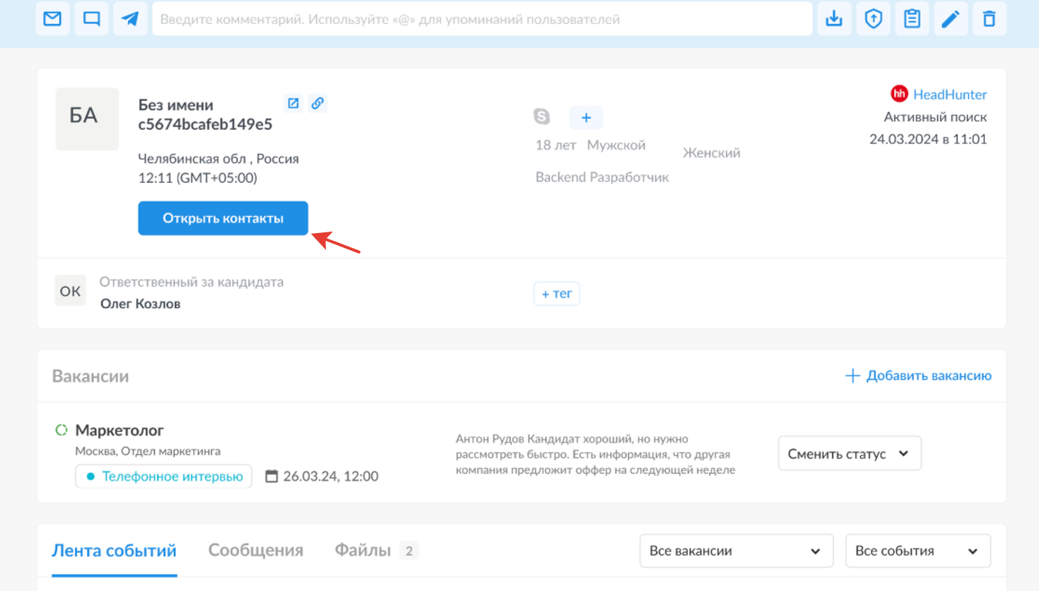 При необходимости можно объединить дубликаты, назначить статус (например, “Отобран на вакансию”) и добавить комментарий — всё это без открытия контактов.